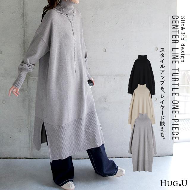 ワンピース ニット ニットワンピース タートルネック スリット 長袖 ロング丈 無地 ゆったり マキシ セーター ハイネック au pay マーケット