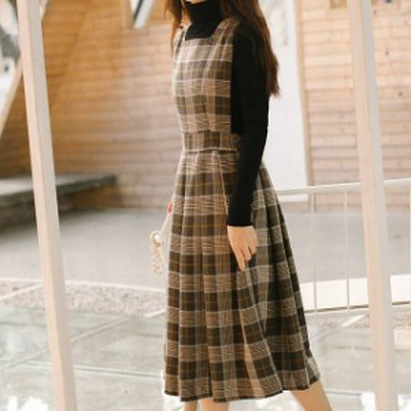 グレンチェック ジャンパースカート 秋 チェックワンピース ロングワンピース チェック柄 秋冬 冬新作 韓国 オルチャン あったか 茶色 au pay マーケット