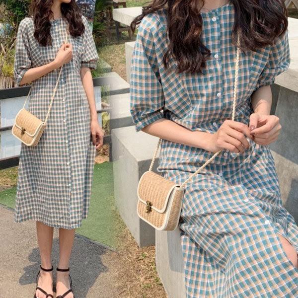 メール便 ワンピース ワンピ チェック柄 ロング丈 ハイウエスト シンプル カジュアル オシャレ キュート 可愛い きれいめ 流行 韓国スタイル 韓国ファッション 夏 バカンス 旅行 natural lily