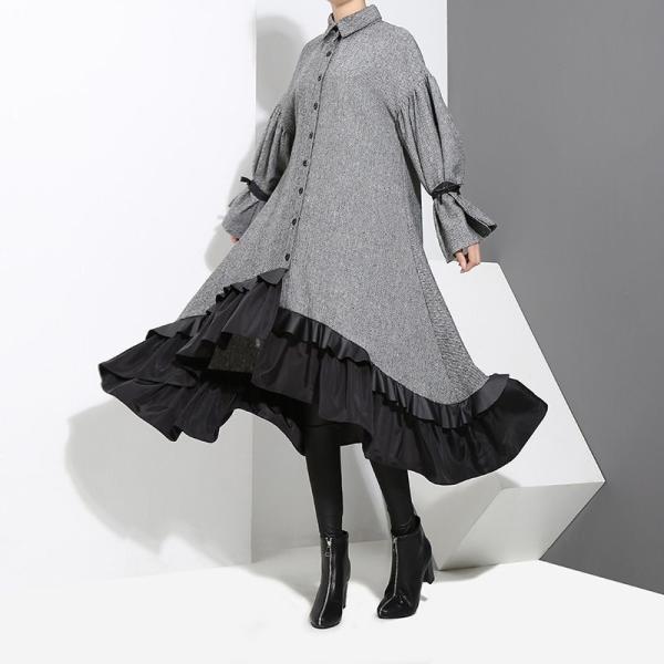 レディースワンピース デザインワンピ ガウンワンピ シャツワンピ 裾フリル aライン 長袖 裾不規則 ロング丈 ミモレ丈 グレー フリーサイズ