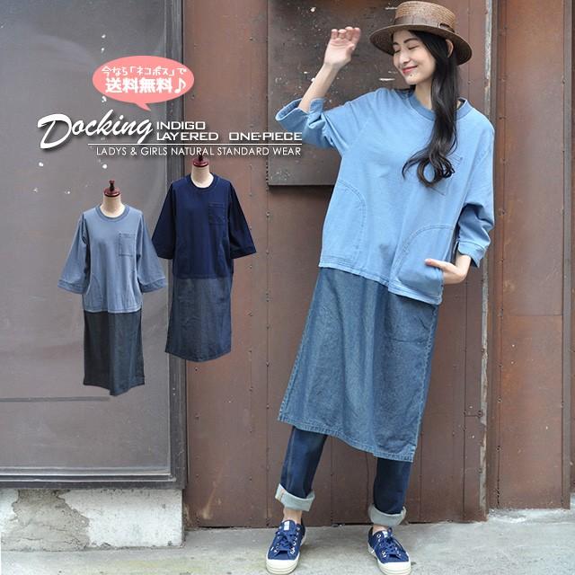 半額セール ワンピース レディース ゆったり 重ね着風 体型カバー カジュアル 藍染 インディゴ天竺tシャツ デニム裾切替 5分袖ドッキングワンピ sch2013 chunky factory 通販 yahoo ショッピング