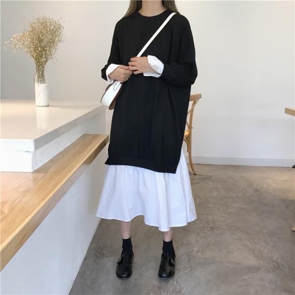 amazon geschesk ドッキングワンピース レディース ワンピース 重ね着 長袖 ロング ゆったり 体型カバー ロングワンピース ニットワンピース マタニティ ママ 春 秋 冬 ブラック ワンピース チュニック 通販