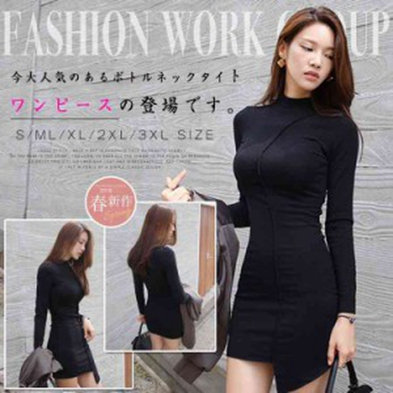 タイトなボディラインがセクシーなタートルネックのボディコンニットワンピ