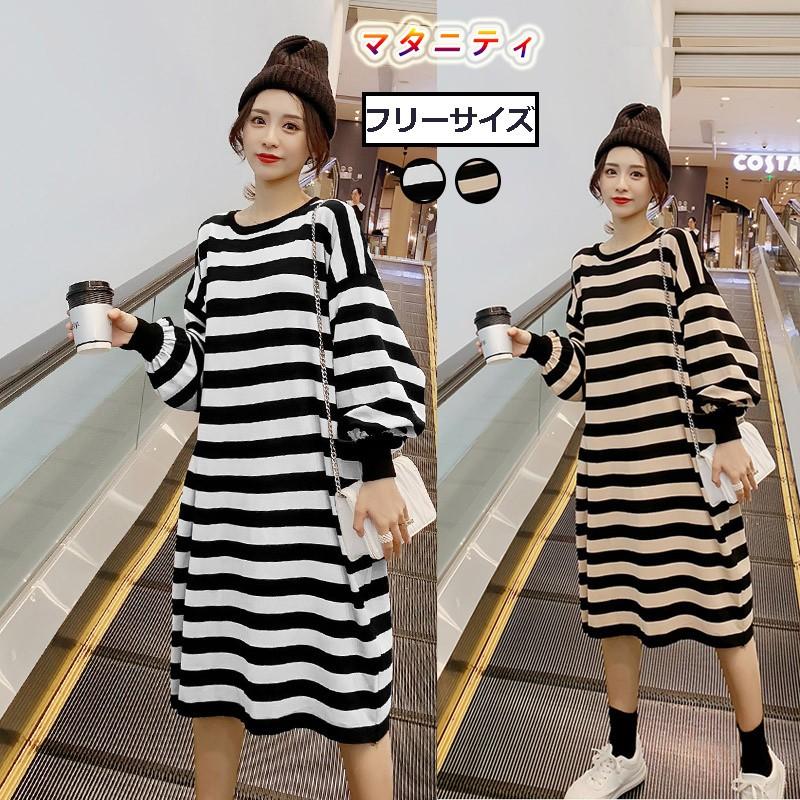 マタニティ ワンピース 秋新作 送料無料 ストライブ ニットワンピース 長袖 妊婦服 膝下丈ワンピース マタニティウェア バルーンスリーブ ゆったり シンプル y19y08f217 アジアンストア 通販 yahoo ショッピング