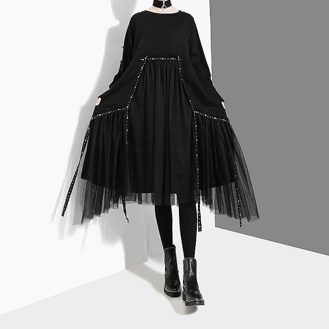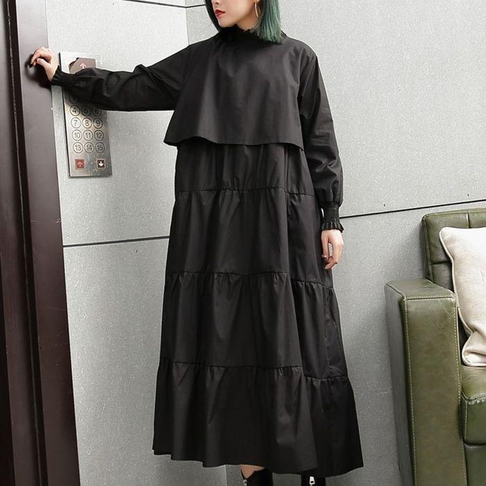 春新作 春 ワンピース 長袖 ティアードワンピース 原宿系ファッション 黒ワンピース モード系 ワンピース ロングワンピース マキシ丈 ハイネック ゆったり 体型カバー 大人カジュアル 個性的服 女子会 20代 30代 40代 ブラック p6525 kirari きらり powered by