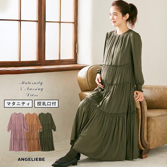 授乳服 マタニティ 服 ワンピース ヴィンテージ サテン ティアード マキシワンピース 妊婦服 長袖 マタニティワンピース ピンク ブラウン カーキ マタニティ授乳服ベビー angeliebe 通販 paypayモール