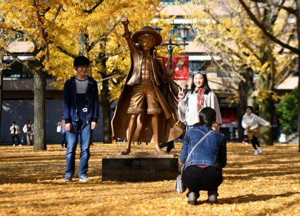 one pieceの ルフィ像 熊本県庁前のプロムナードに登場 撮影を待つ家族連れが行列 くまニッチ