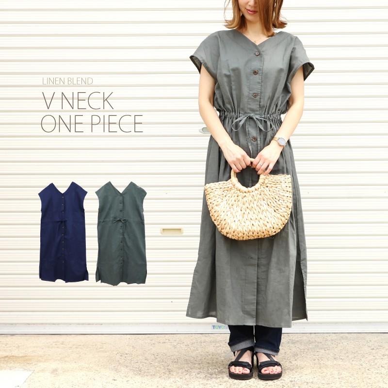 薄地 リネンワンピース 2way 前開きシャツカラータックドレス ラグランスリーブ 袖スリット ネイビー free a013j neb1