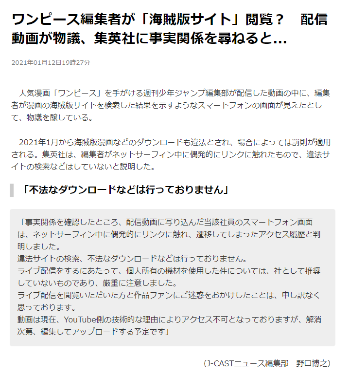 集英社 ワンピース編集者が海賊版サイトを見てたのは 偶然 麦割れの一味 違法漫画 上級無罪