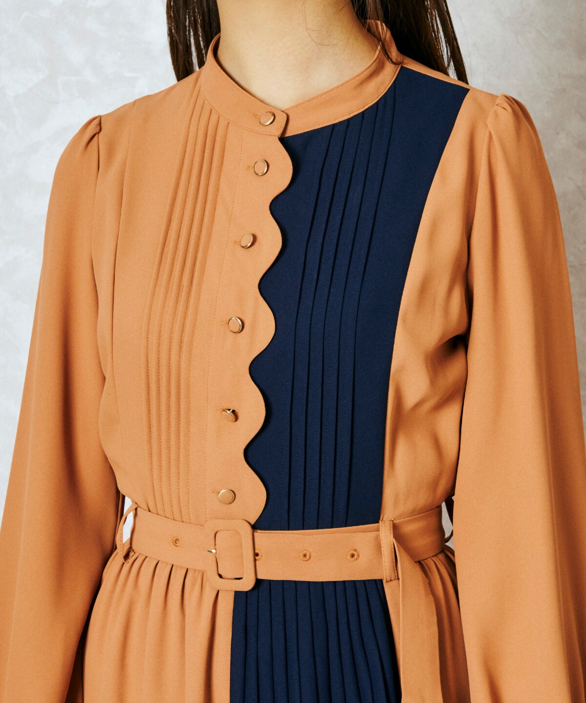 スカラップデザインカラーブロックプリーツワンピース