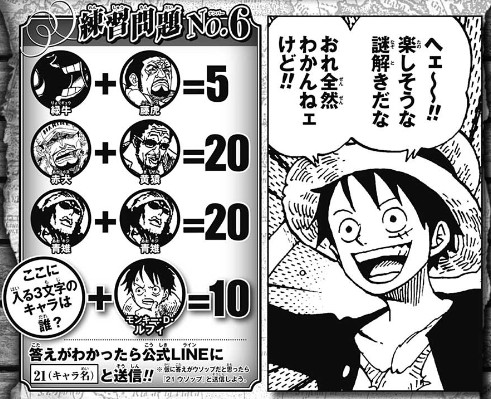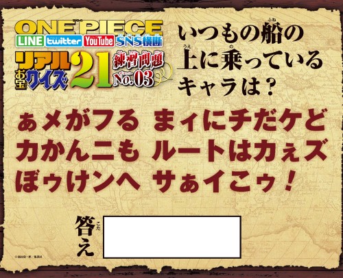 one pieceスタッフ 公式 on twitter ジャンプ本誌や公式lineなどで onepiece リアルお宝クイズ21 の練習問題を続々出題中 no 7解けるかな one piece公式lineに 07ヒント と送信するとヒント出現 21 正解のキーワード を送信するとお祝いメッセージ