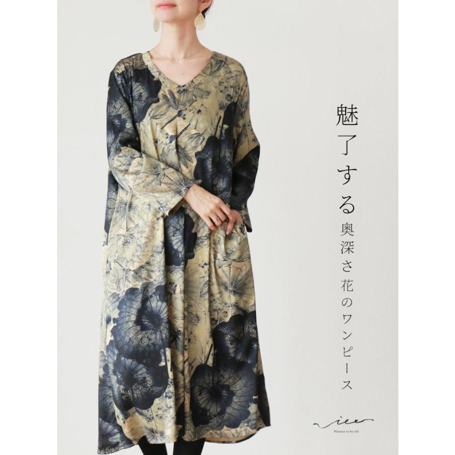 お気に入りの グレー yohaku 和の花のやわらかワンピース40代 50代 60代 春 花柄 2月17日22時販売新作 ワンピース
