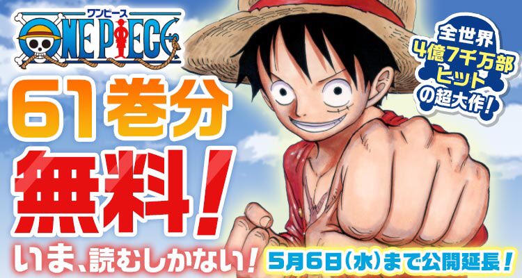 ゼブラック v twitter テレビcm放送開始記念 one piece 61巻分無料公開が ゼブラック 限定で さらに無料公開期間を延長 6 30 火 23 59まで読める 62巻604話からは無料チケットで 続きを読もう ワンピース は931話までが 無料チケット範囲 集英社公式