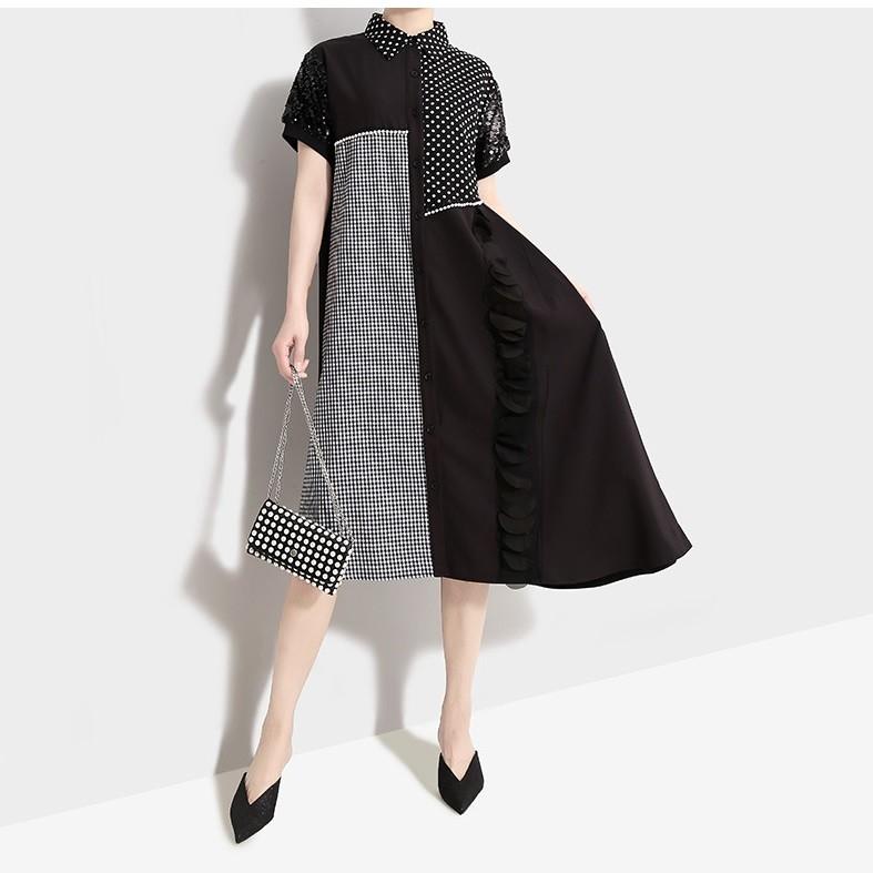 ミニ丈個性派ワンピース 襟付き 7分袖 台形スカート ブラック 犬 パーティ お呼ばれ 二次会 結婚式 ptnmo0102 shop suba