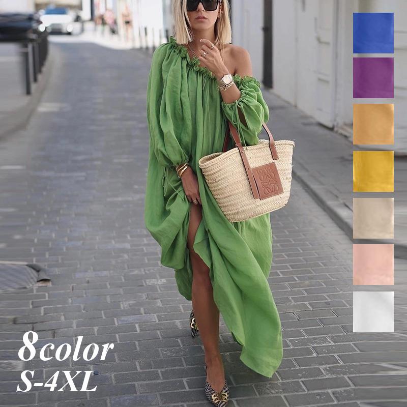個性的でおしゃれな海外デザイン アシンメトリーのきれいめロングワンピース 4色