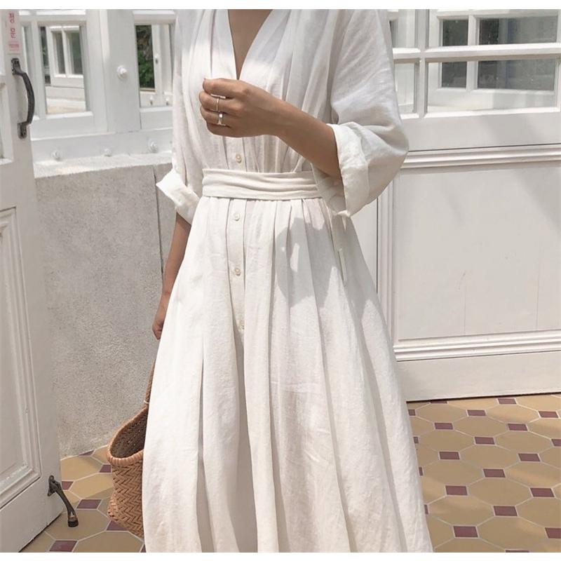 ワンピース 前開きワンピース ナチュラル 七分袖 長袖 リネン コットン buyee buyee 日本の通販商品 オークションの代理入札 代理購入