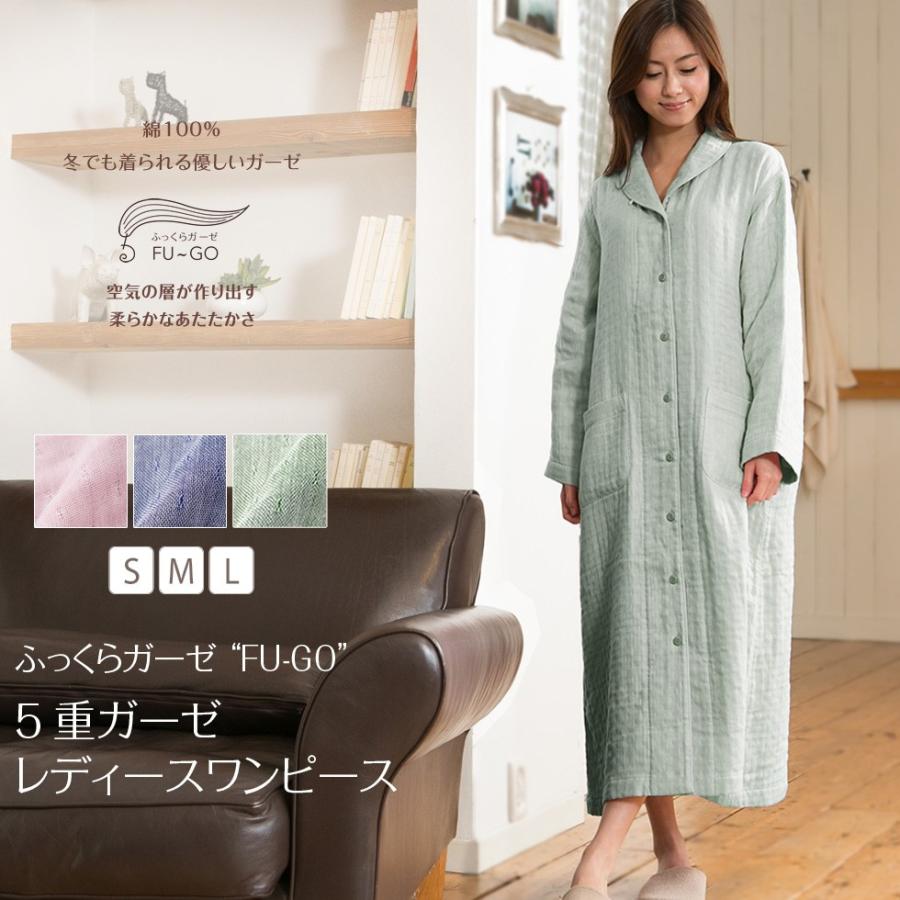 ふわふわ柔らかダブルガーゼレディースワンピース 長袖 前開き 襟あり