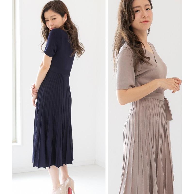 サマーニット レディース ワンピース プリーツ ニットワンピ 半袖 カシュクール vネック ひざ丈 ワンピ エレガント きれいめ 大人 シンプル 春 夏 om80 onepi lansh ランシュ 通販 yahoo ショッピング