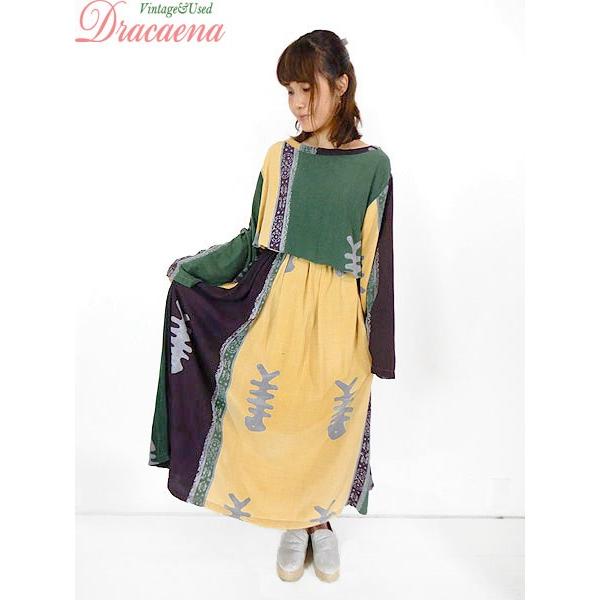 古着 ワンピース 民族 古代風 魚の骨 模様 イラスト 全面 プリント ロング ワンピース 長袖 l位 古着