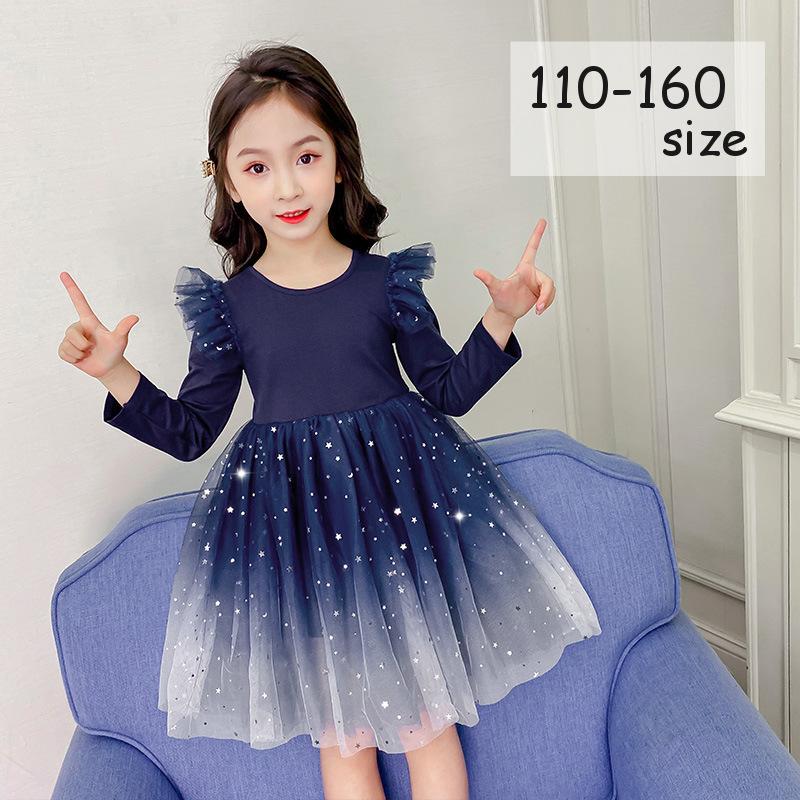 ワンピース キッズ 子ども 子供服 女の子 ジュニア 長袖 チュール フレア 肩フリル 膝丈 星 柄 ラメ おしゃれ シンプル 夜空 かわいい 無地 プラスナオ paypayモール店 通販 paypayモール