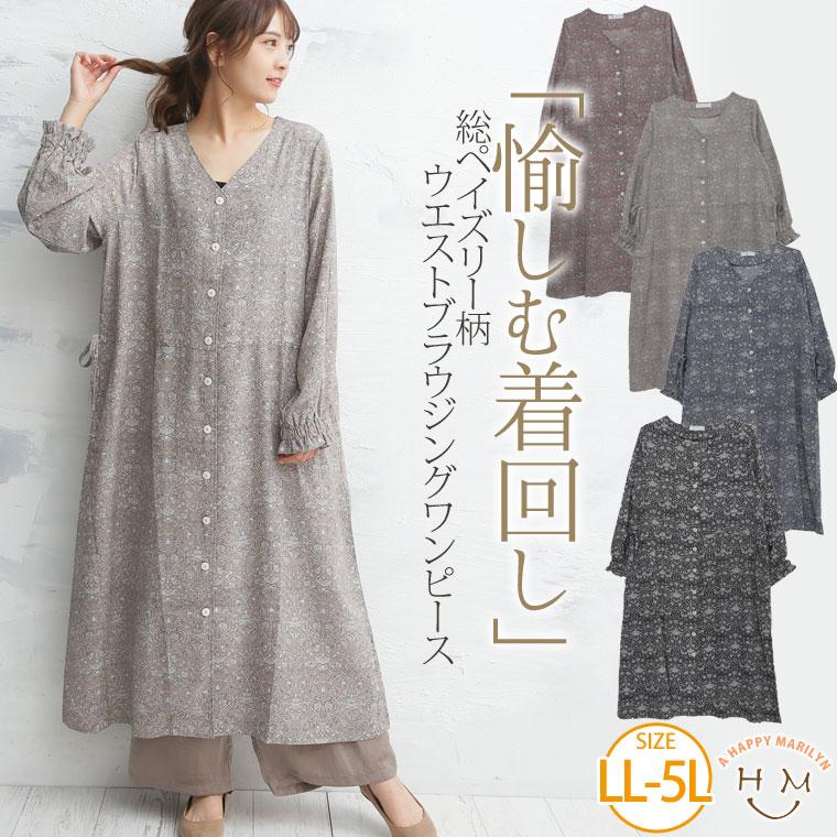 ウエストブラウジング前開きワンピース 大きいサイズ レディース ワンピース ワンピ ブラウジングワンピース vネックワンピース 長袖 ミモレ丈 ロング丈 vネック ブラウジング リボン ポケット バルーンスリーブ 春新作 春 秋 3l 4l 5l カーキ ブラック ゴールドジャパン