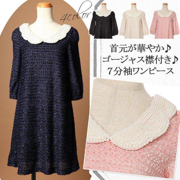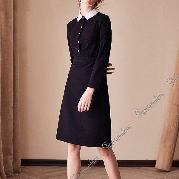 大きいパール襟のベルベットワンピース レディース 長袖 柔らかい雰囲気 ガーリーファッション 大きいパール襟 ベルベット 黒ワンピース ガーリー パール使い パール 清楚 もベルベット 肌触りがよく ブラック lalas powered by base