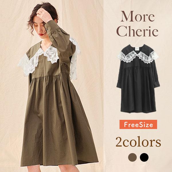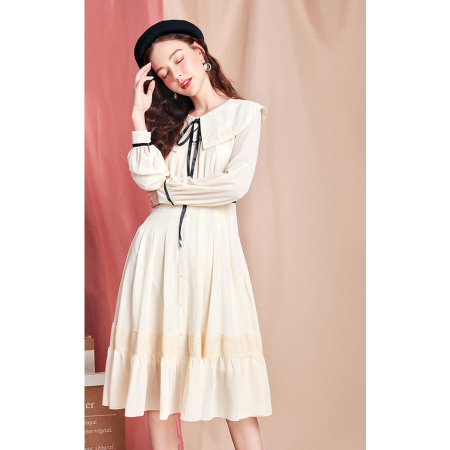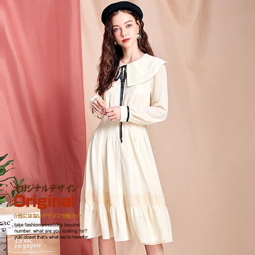 早割クーポン セーラー襟ワンピース オリジナルデザイン ラウンドネック 大きい襟 膝下丈 長袖 aライン 無地 レトロ風 ギャザー 前ボタン 紐リボン レトロ セーラー風 学生風 気質アップ www skylanceronline com