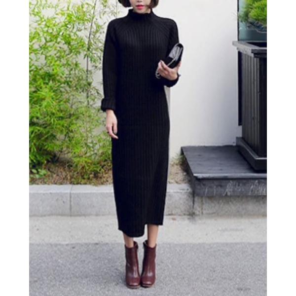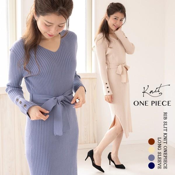シンプル大人ladyに ニットワンピース ロング丈 ニット ワンピース 膝下丈 長袖ワンピース ニットワンピ 秋ワンピース スリット入り シンプル 無地 大人 女性 ペット雑貨のテイクオフ