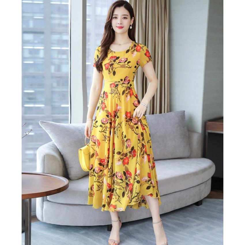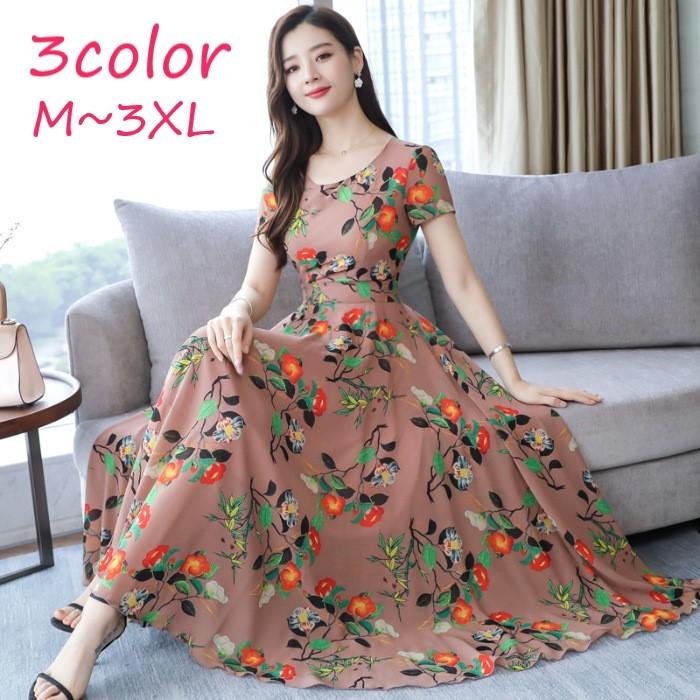 ワンピース レディース aラインワンピース ロングワンピース 花柄 ゆったりウエスト 半袖 大柄 体型カバー vネック 韓国服 happy toon powered by base