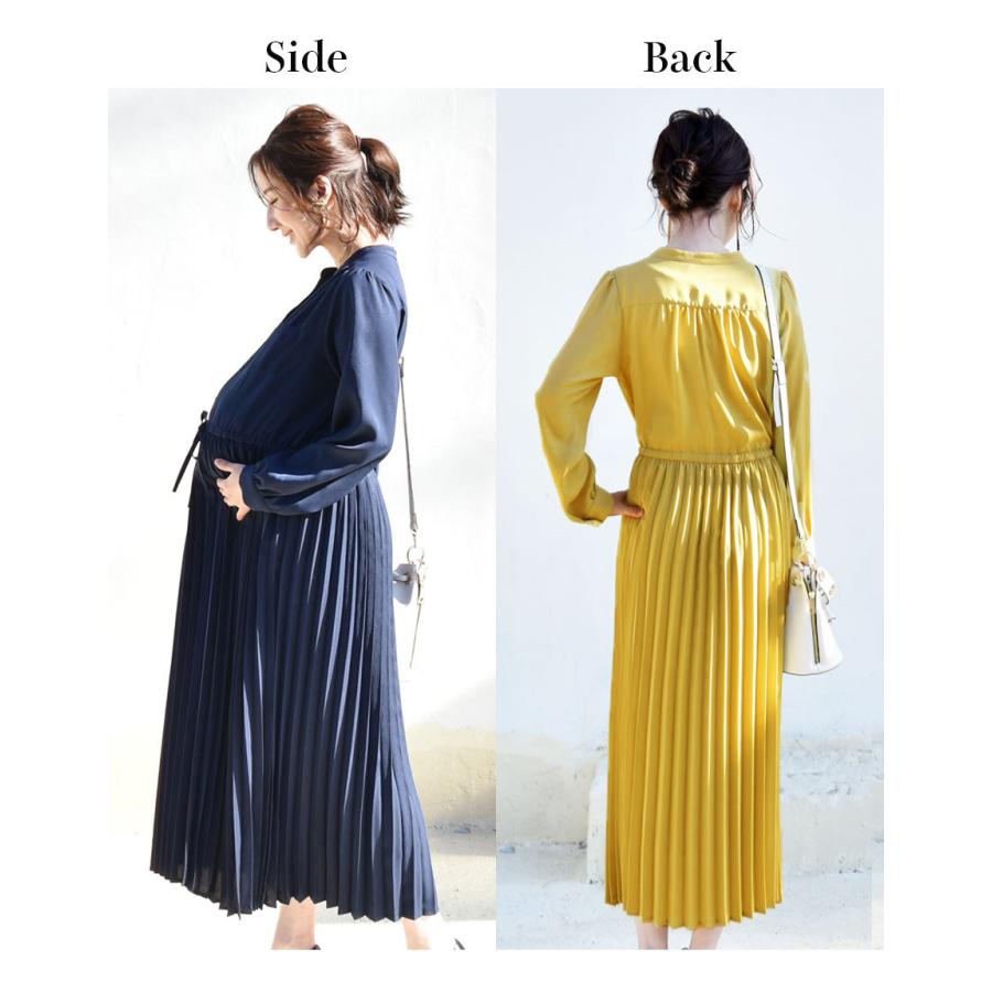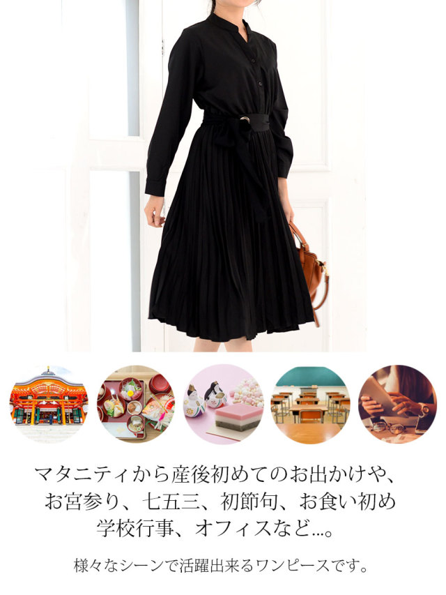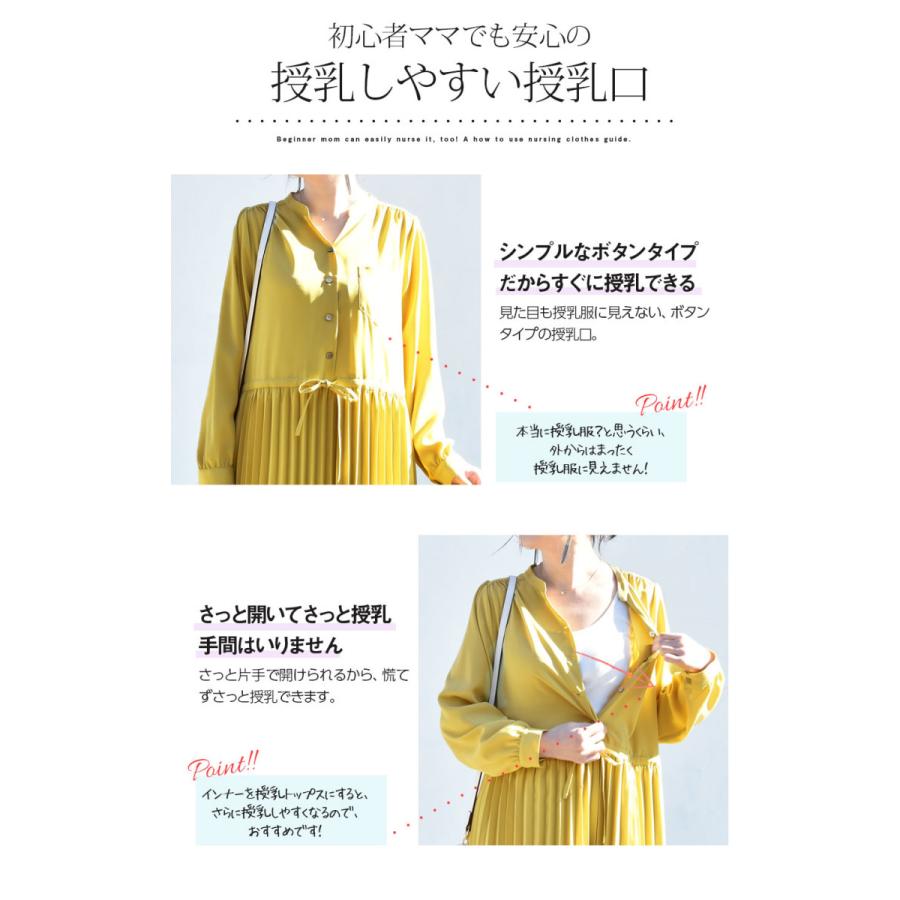 授乳服 マタニティ スタンドカラードレスシャツプリーツワンピース ボタンタイプの授乳口 マタニティ 授乳服 産前 産後 フォーマル オフィス 保護者会 学校行事 スタンドカラー ワンピ ロング丈 細プリーツ スタンドカラー 長袖 シンプル