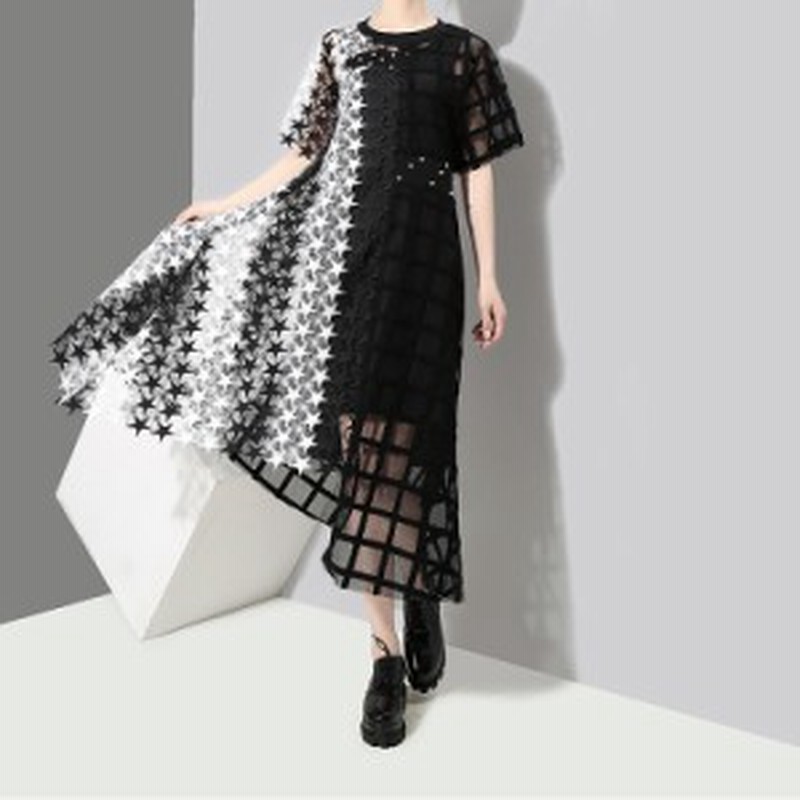 星柄ワンピース 刺繍ワンピース レース 黒 エレガント カジュアル パッチワーク 演奏会 パーティー 二次会 結婚式 お呼ばれ 同窓会 ひざ下丈 韓国アパレル 通販サイト ネットショップ amour powered by base