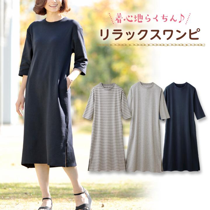 レディース 婦人 ワンピース 五分袖 七分袖 肘下 裾スリット らくちん 左右ポケット ネイビー 杢グレー グレーボーダー 着心地らくちんリラックスワンピ 01470369 ジャストパートナー yahoo 店 通販 yahoo ショッピング