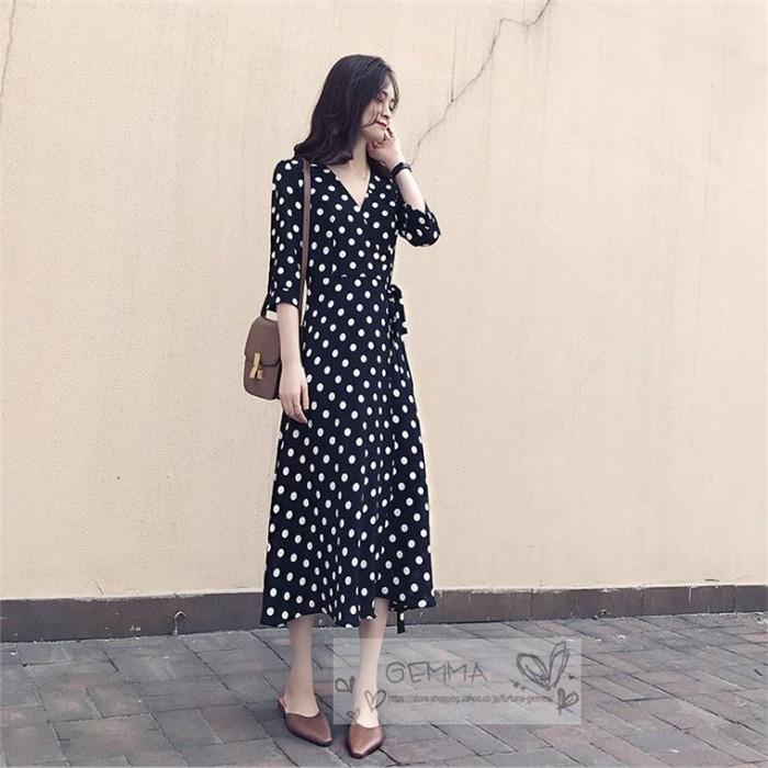 ドット ワンピース レトロ ロング 水玉 ワンピース ドット柄 ワンピ カシュクール vネック ロングワンピース プチプラファッション通販 mdk store