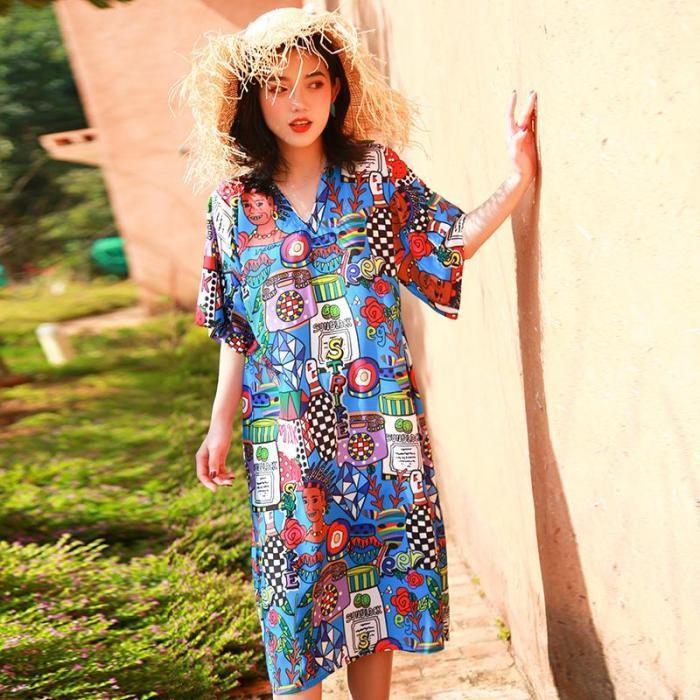 個性的なデザイン 大人カジュアル 派手かわいい 柄 リゾート vネック tシャツワンピース 楽ちん 送料無料 ok2947 shiawase clothes 通販 yahoo ショッピング