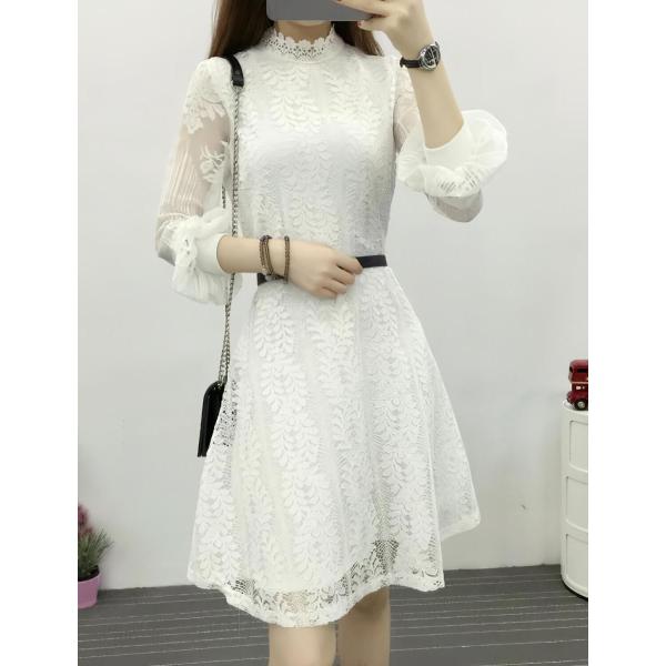 大人清楚スタイル ハイウエスト足長切り替え 膝丈長袖ワンピース 白 h09ks9 4720