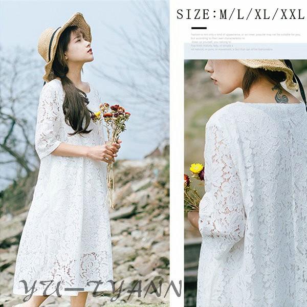マキシワンピース レース 白 ホワイト シフォンワンピース マキシ丈ワンピース 通勤 aライン ラウンドネック 五分袖 夏ワンピース オシャレ 旅行 可愛い