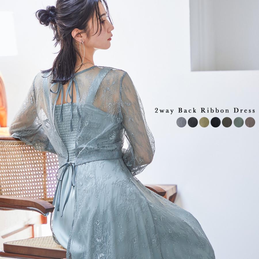 結婚式 ワンピース パーティードレス 2way バックリボン 無地 ロング 総レース 透け感 ウエストゴム 長袖 袖あり オケージョン 1 5次会 春 夏 秋 冬 パーティドレス 二次会 謝恩会 レース 成人式 同窓会 体型カバー 入学式 卒業式