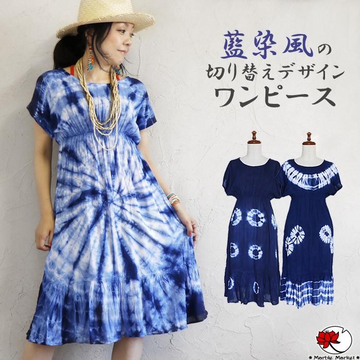 エスニック ワンピース 半袖 藍染 藍染風 タイダイ染め 絞り染め 胸下切り替え レディース ファッション アジアン 涼しい リゾート 30代 40代 50代 2 balu エスニックのマーブルマーケット 通販 yahoo ショッピング