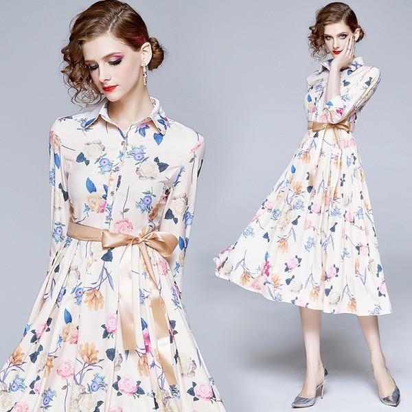 総柄ロングワンピース 秋 春 ワンピース ボタン 柄 ダイヤ ドット 長袖 ハイウエスト シフォン 膝下 ミモレ丈 デート お出かけ フレア ドレス クラシック リボン きれいめ 韓国ファッション 大人 通学 通勤 レディース 女性 21ss3129on