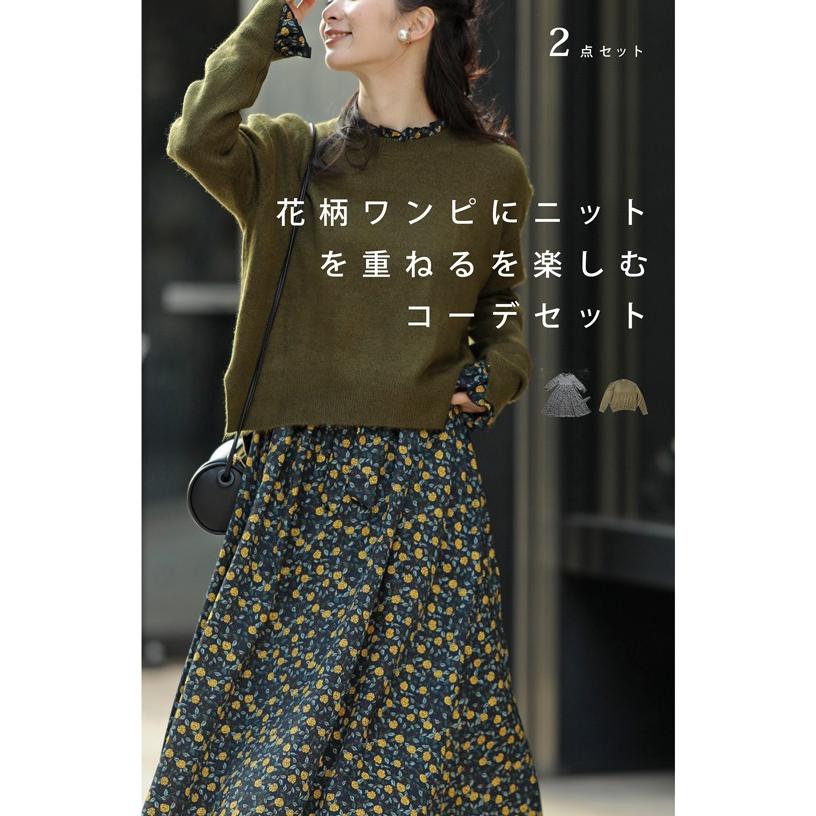 french pave 重ね着を楽しむ花柄ワンピースとニットのコーデ2点セット トップス ワンピース カーキ コーデセット cawaii w6s0010 french pave 通販 yahoo ショッピング