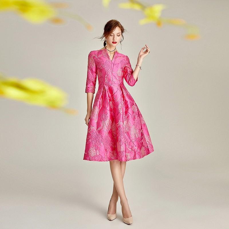 結婚式 お呼ばれ パーティードレス 二次会 袖あり 膝下 20代 30代 華やか ワンピース ピンク 上品ワンピース 演奏会 発表会 サマードレス d002 hollys design powered by base