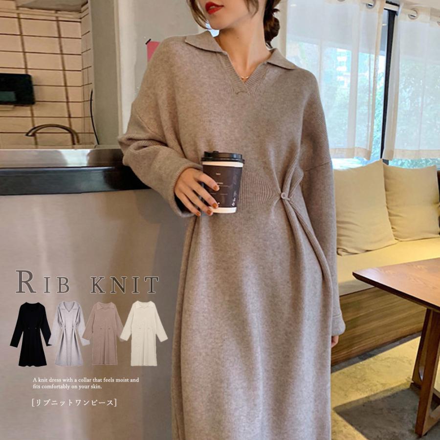襟付き ニットワンピース 膝下丈 2色 グレー ホワイト 大人カジュアル 可愛い レディース ファッション 韓国 オルチャン au pay マーケット