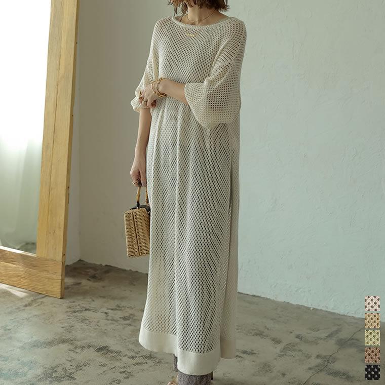 リネン混透かし編みニットワンピース