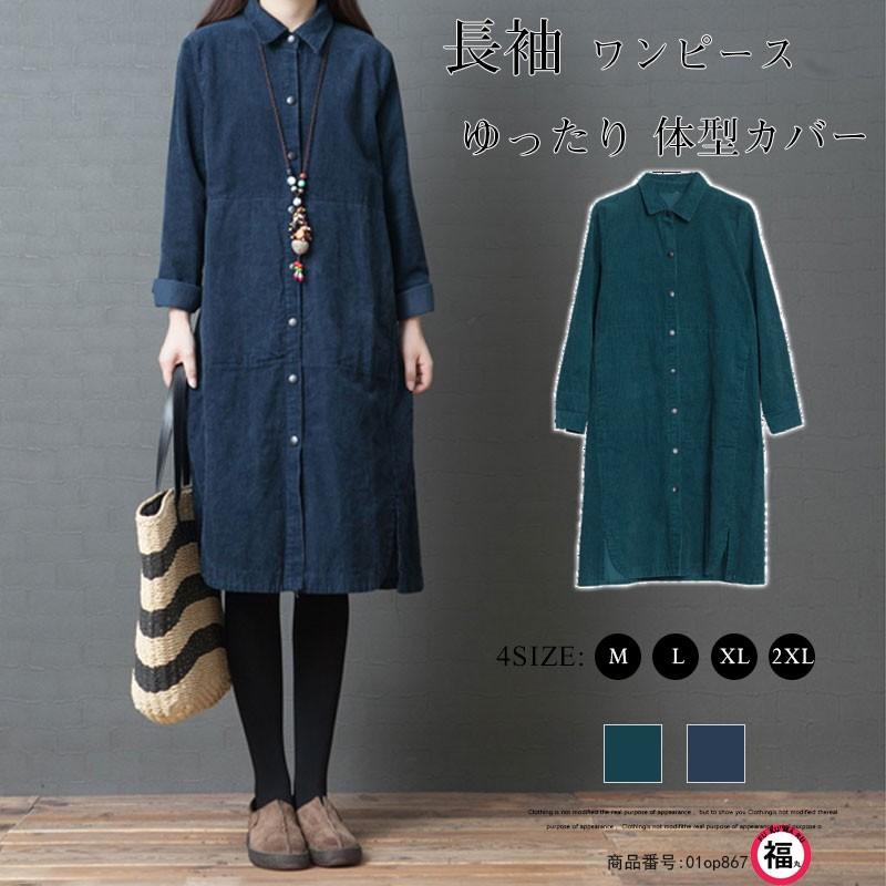 シャツワンピース 長袖 レディース 膝丈ワンピース マキシ丈 カバーオール 大きいサイズ コーデュロイ カバーオール ゆったり 前開き 無地 春新作 01op867 福丸 通販 yahoo ショッピング