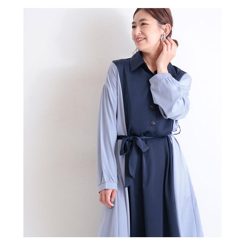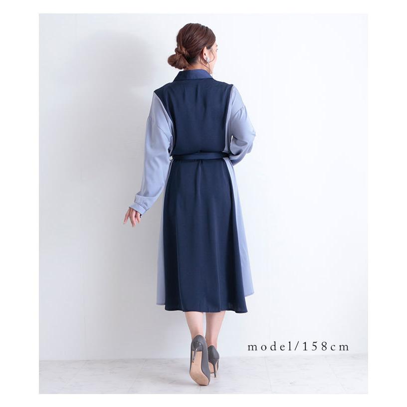 ワンピース レディース 長袖 バイカラー ブルー 青 春服 秋服 冬服 切替え フレア 秋コーデ エレガント サワアラモード 大人 可愛い 洋服 30代 40代 50代 60代