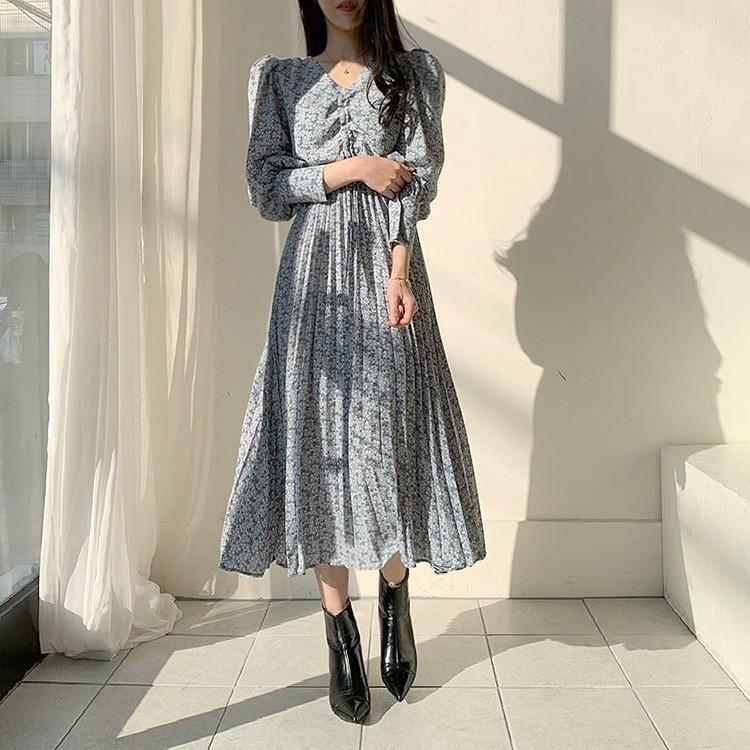 ロングワンピース ワンピ 韓国 コーデ きれいめ 40代 30代 長袖 フォーマル 上品 大きいサイズ おしゃれ 花柄 マキシ丈 ロング丈 ゆったり 体型カバー 青 ハイネック dress plaatje powered by base