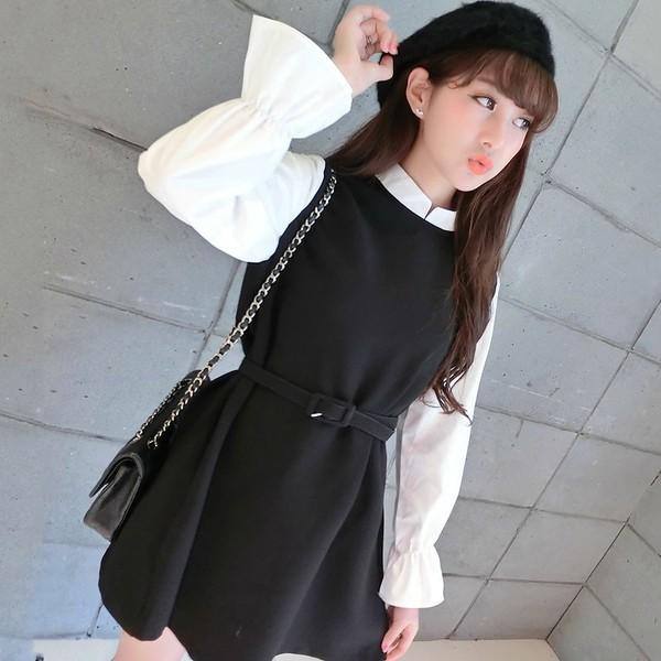 韓国通販 ワンピース トリコロールの可愛い長袖ワンピース 韓国 ワンピース ドレス レディースmarron マロン