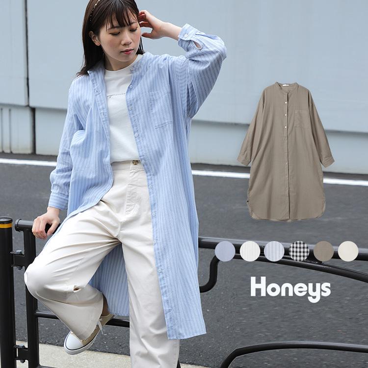ワンピース シャツワンピ マオカラー 無地 ギンガム ストライプ 羽織り レディース 春 honeys ハニーズ マオカラーシャツワンピ ハニーズ オンラインショップ 通販 paypayモール