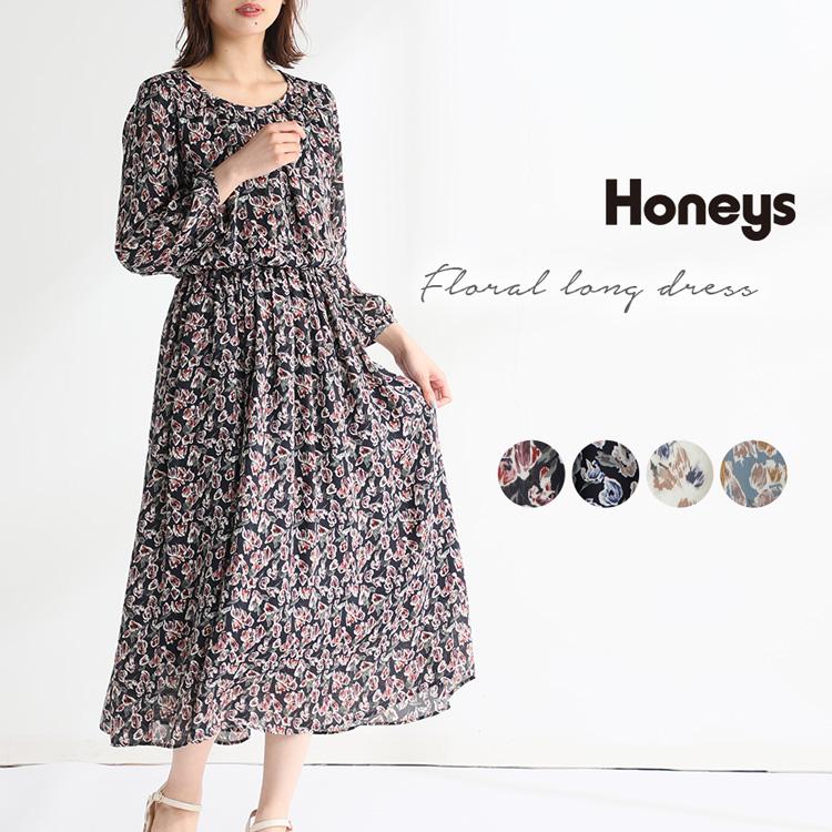 長袖 ロングワンピース カジュアル ワンピース レディース ロング 花柄 水玉 春 モノトーン シャツワンピース sale セール honeys ハニーズ 釦使いvネックワンピース ハニーズ オンラインショップ