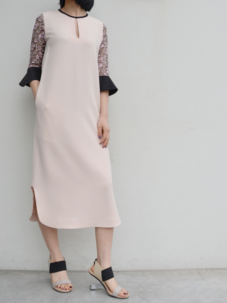 未使用品 マメクロゴウチ mame kurogouchi 17ss ワンピース ひざ丈 vネック 袖レース 七分袖 2 ピンクベージュ ym レディース
